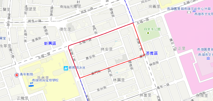 北起:五福一路與新興區為鄰 南至:廈門街與林圍里為界 東起:光華一路與中正里為界 西至:民權一路與新興區為鄰 |